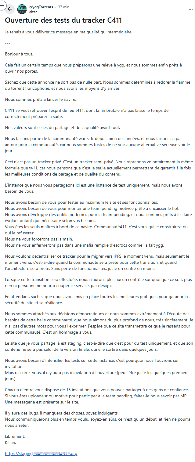Deux mois passent. La communauté est orpheline, éparpillée entre Sharewood et autres petits trackers qui tiennent pas la charge. Et puis début 2026, surprise : C411 ouvre ses portes. Nouveau tracker, nouvelle équipe officiellement, nouvelle structure. Mais curieusement, une partie de la base de données YggTorrent a “fuité” et se retrouve là. Les uploaders reçoivent des invitations personnalisées. Le site est gratuit au lancement, pas de mode Turbo, pas de restrictions débiles. Discours humble : on veut juste faire revivre l’esprit du partage.