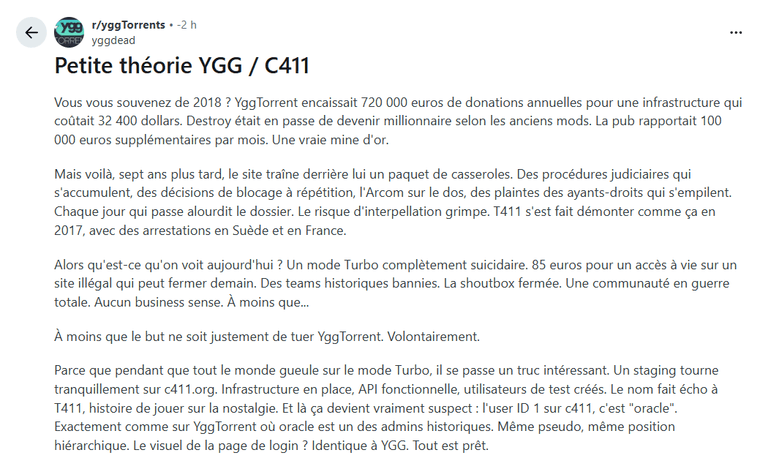Parce que pendant que tout le monde gueule sur le mode Turbo, il se passe un truc intéressant. Un staging tourne tranquillement sur c411.xxx. Infrastructure en place, API fonctionnelle, utilisateurs de test créés. Le nom fait écho à T411, histoire de jouer sur la nostalgie. Et là ça devient vraiment suspect : l’user ID 1 sur c411, c’est “oracle”. Exactement comme sur YggTorrent où oracle est un des admins historiques. Même pseudo, même position hiérarchique. Le visuel de la page de login ? Identique à YGG. Tout est prêt.Le scénario devient limpide. YggTorrent ferme boutique dans quelques semaines. Pas sous pression judiciaire, non. Les admins décident eux-mêmes de fermer. Communiqué sobre : “Après huit années de service, nous mettons fin à l’aventure YggTorrent. Merci à la communauté.” Point final.